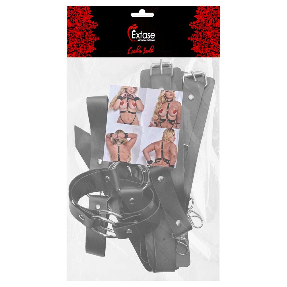 O modelo Eduarda possui braceletes para as mãos, braceletes para os braços e coleira totalmente integrados , criando uma composição poderosa e visualmente irresistível. Pode ser usado tanto de frente quanto nas costas, permitindo diferentes formas de explorar o corpo e a sensualidade.