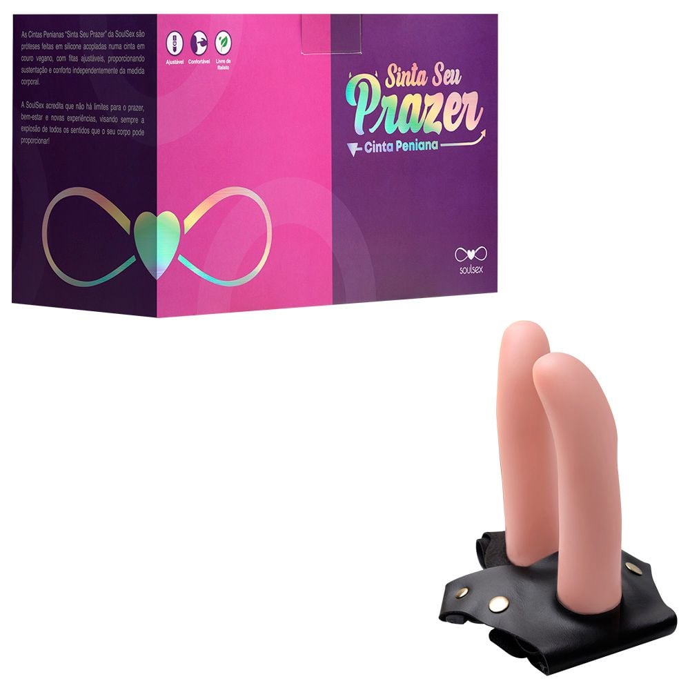 Cinta Peniana Dupla com Pênis Ponto G 15,5 x 4 cm - Soulsex. A Cinta Peniana Dupla com Pênis Ponto G da Soulsex foi desenvolvida para proporcionar uma experiência intensa e inovadora, ideal para a mulher ativa ou para a inversão de papéis. Confeccionada em material reforçado, esta cinta ajustável possui fivelas que garantem um ajuste seguro e confortável ao corpo. Acompanha duas próteses realísticas, ambas feitas em silicone de alta qualidade, com glandes definidas e veias salientes, oferecendo uma sensação autêntica e prazerosa. As próteses, projetadas para estimular o ponto G, podem ser usadas separadamente da cinta, proporcionando versatilidade em suas práticas íntimas.