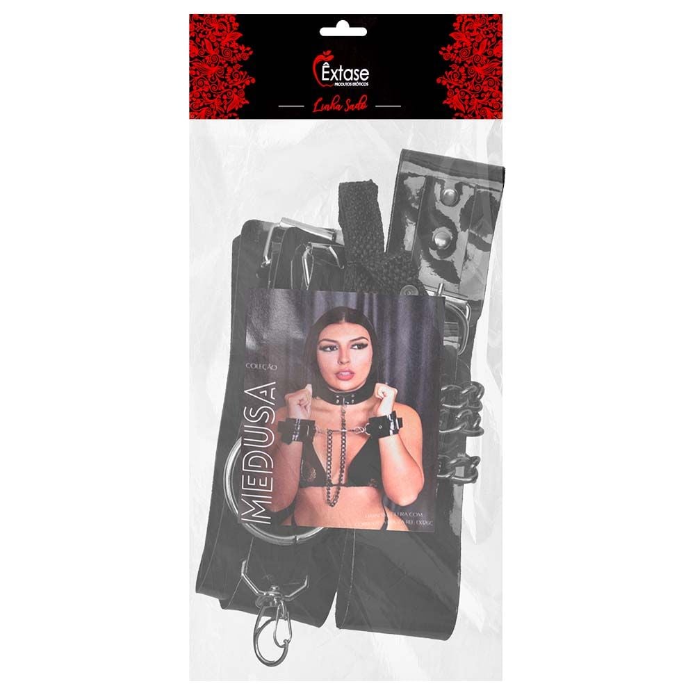Desperte seus desejos mais profundos com a Coleira com Corrente e Algema Medusa Sado da Êxtase. Esta peça provocante do universo BDSM combina visual impactante com estrutura robusta, ideal para quem deseja explorar o prazer do controle com segurança e intensidade. Produzida em couro sintético laminado que imita vinil, ela garante resistência, conforto e um brilho marcante que instiga o olhar.