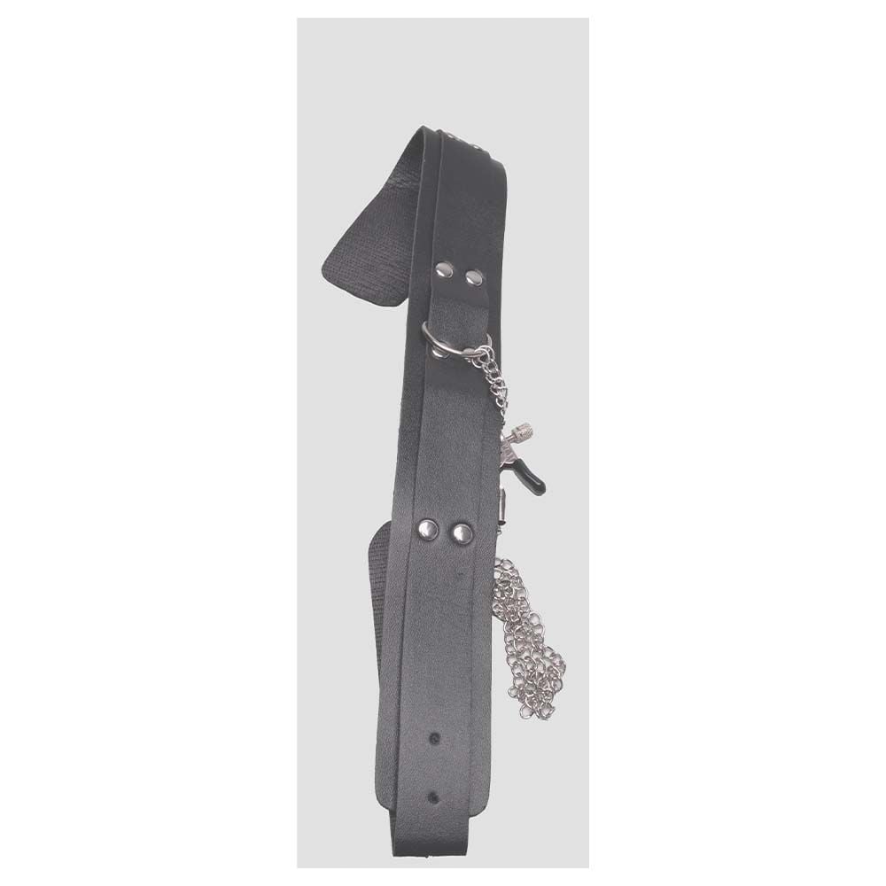 Corrente com Prendedores de Mamilos: A corrente metálica é conectada a prendedores de mamilos, adicionando uma dimensão extra de controle e excitação. Os prendedores são ajustáveis, permitindo um nível de pressão personalizável.
