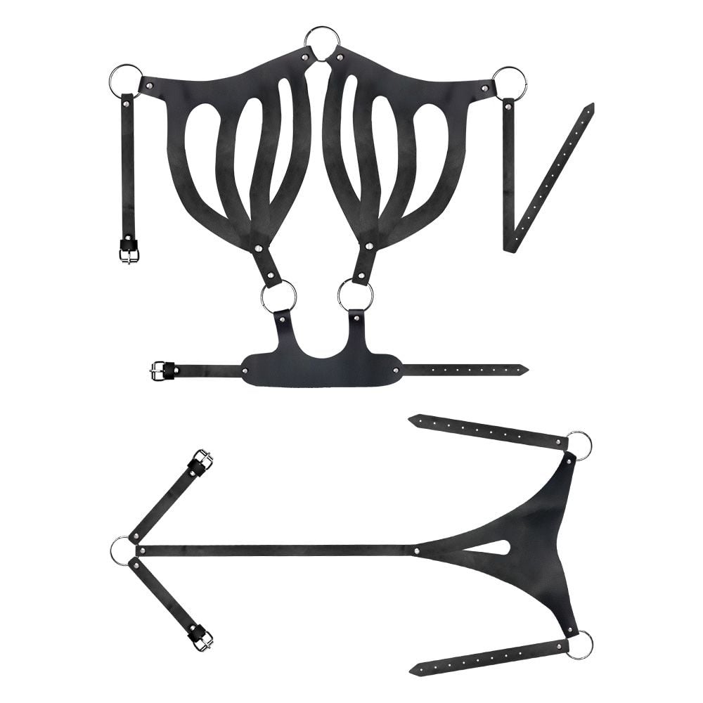 Confeccionado em couro sintético de alta resistência, o conjunto conta com detalhes em rebites e fivelas metálicas que permitem regulagem perfeita ao corpo. O design realça as curvas e promove um encaixe confortável, combinando firmeza com liberdade de movimentos.