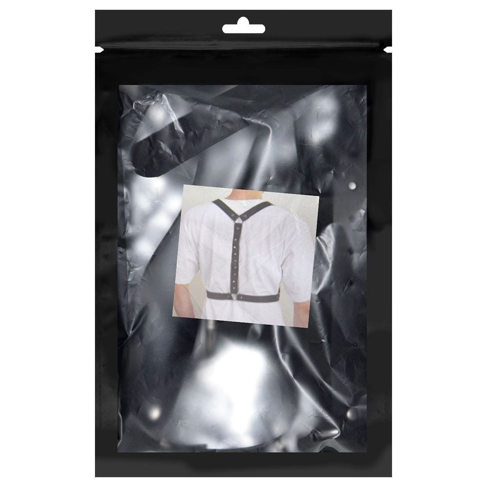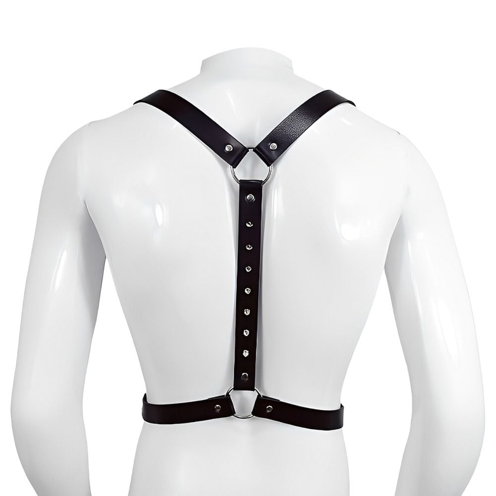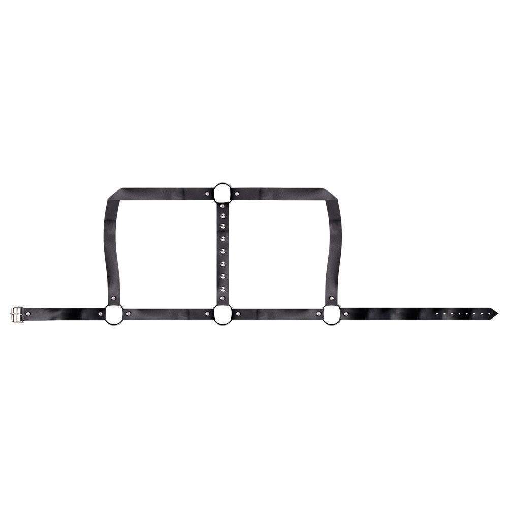 Confeccionado em couro sintético resistente, o harness apresenta rebites e spikes estrategicamente posicionados, além de fivelas e correntes metálicas que conectam as peças com firmeza e estilo. Ideal para uso em fetiches, dominação ou momentos em que você deseja assumir o controle da situação.