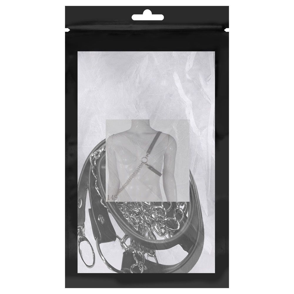 Confeccionado em couro sintético de alta resistência, com detalhes em rebites e correntes metálicas que conectam cada parte da peça, este acessório ajusta-se com precisão ao seu corpo, oferecendo conforto e segurança durante as experiências mais ousadas.