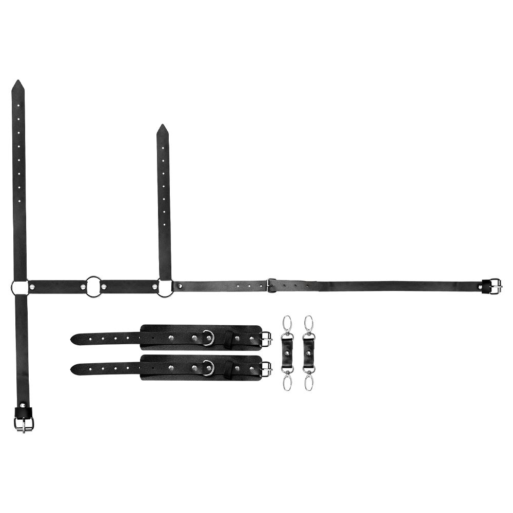 Harness com algemas incorporadas para experiências de contenção e dominação;
