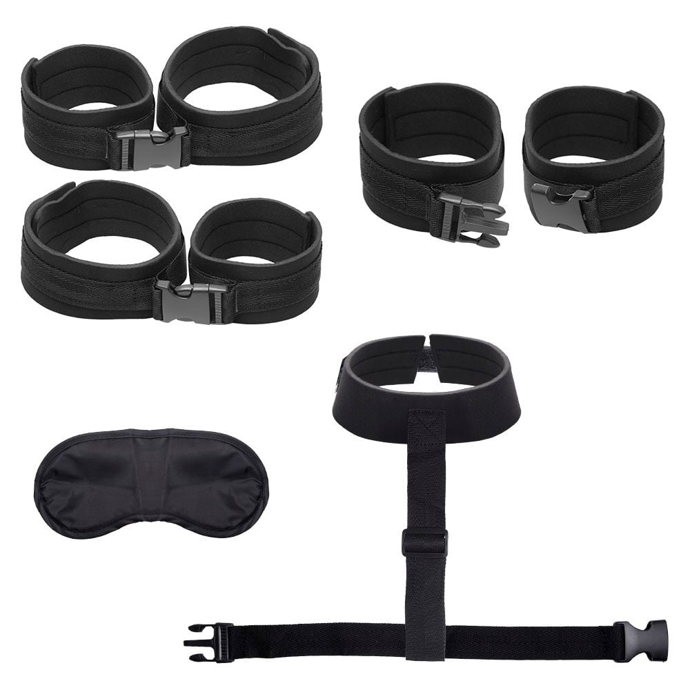 Kit completo com algemas, tiras ajustáveis, coleira e venda.