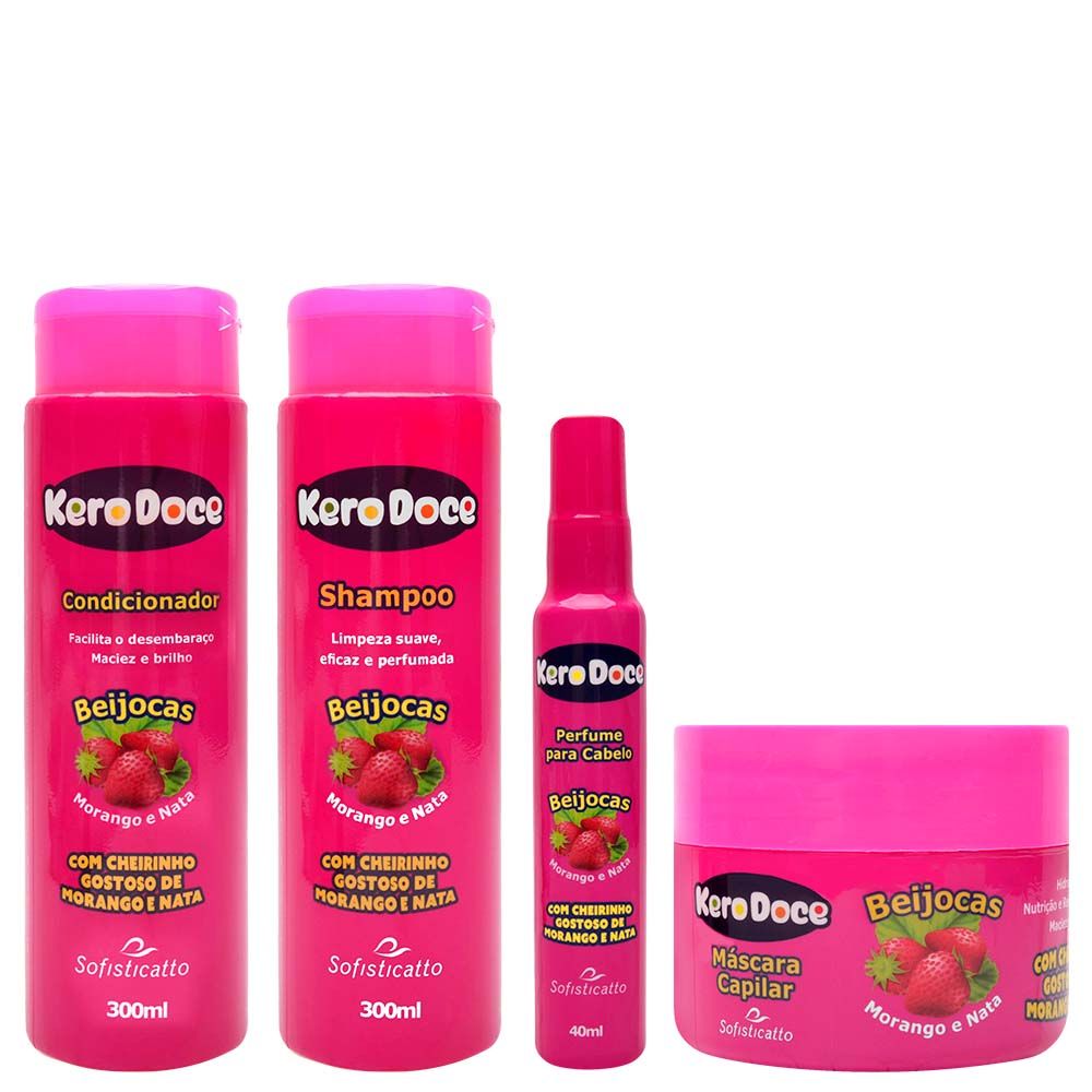 Kit Capilar Completo Beijocas 4 Itens - Sofisticatto. Cuidado completo com um aroma irresistível. O Kit Capilar Completo Beijocas da Sofisticatto foi desenvolvido para proporcionar um tratamento completo para os cabelos, unindo hidratação, nutrição e perfume duradouro. Inspirado no aroma do famoso Fini Beijocas, esse kit traz uma fragrância deliciosa de morango com nata, deixando os fios perfumados e sedosos.