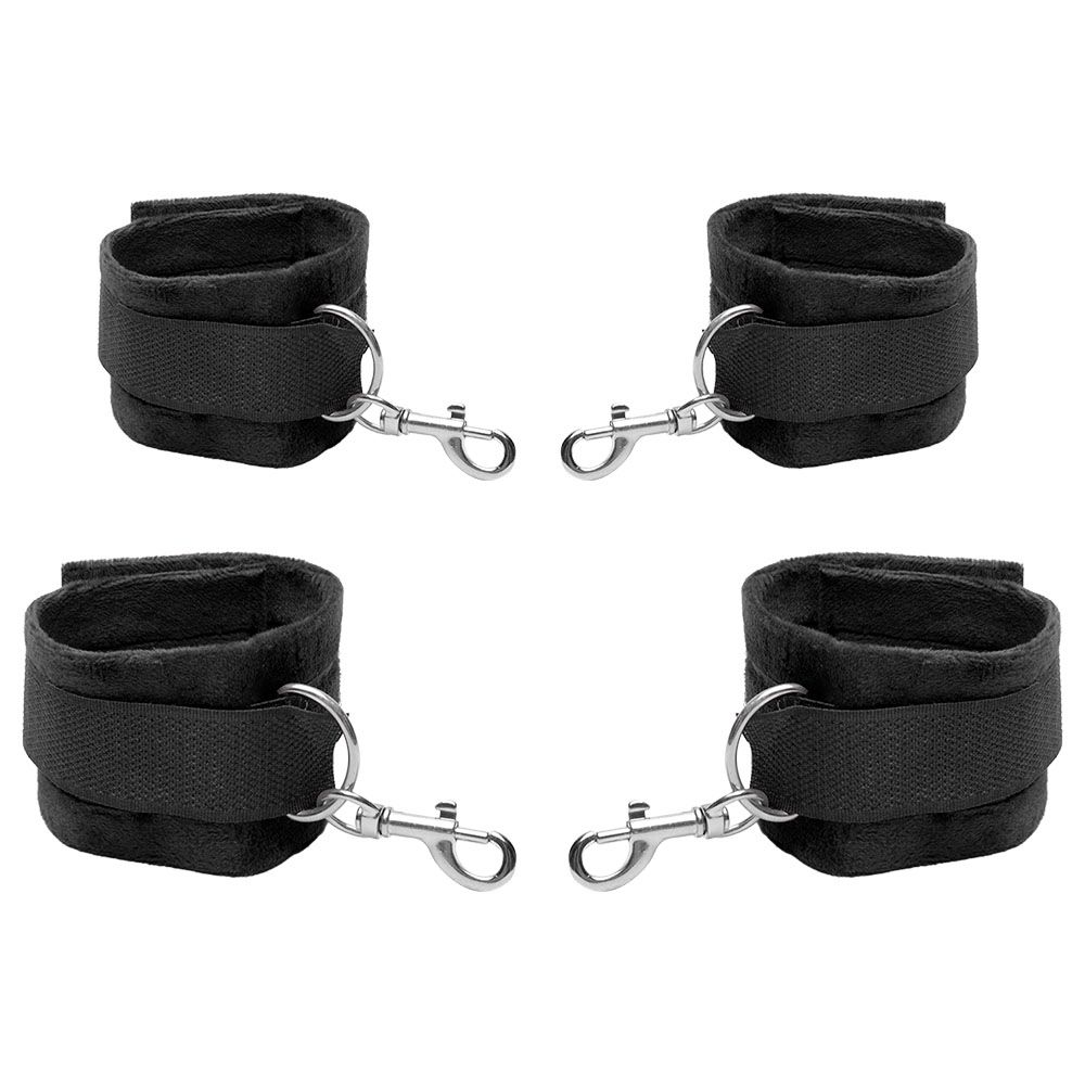Fabricado em poliéster, PVC e metal, o kit oferece resistência e conforto, garantindo segurança durante o uso e durabilidade para diversas sessões. Cada peça combina funcionalidade com um visual elegante e instigante.