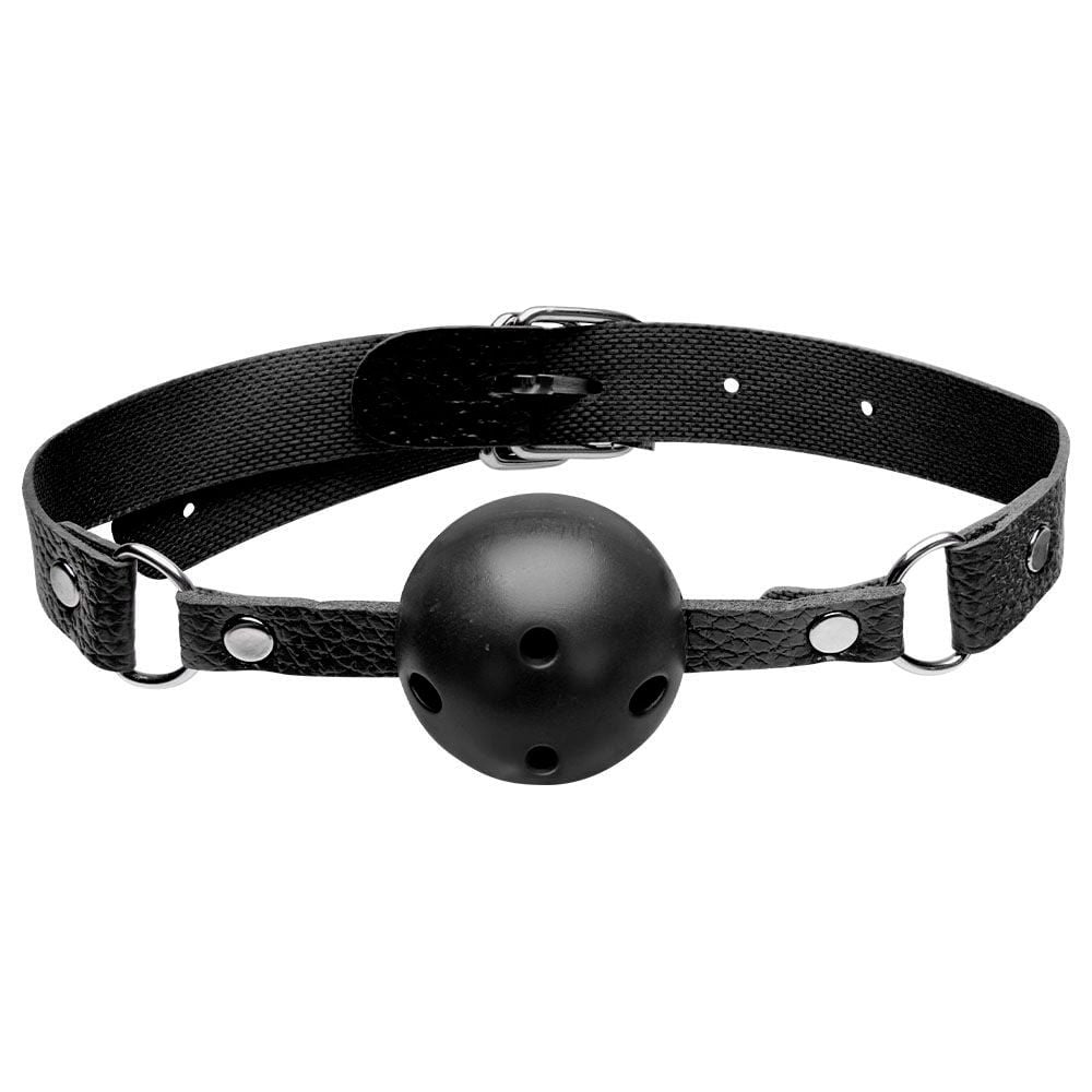 Mordaça: circunferência ajustável (41–55 cm), bola de 4,5 cm — para experiências de controle e submissão;