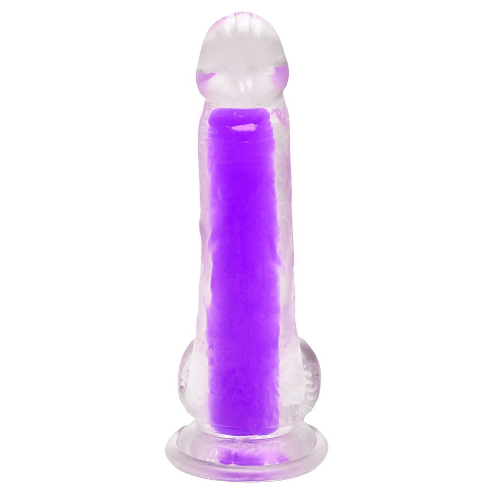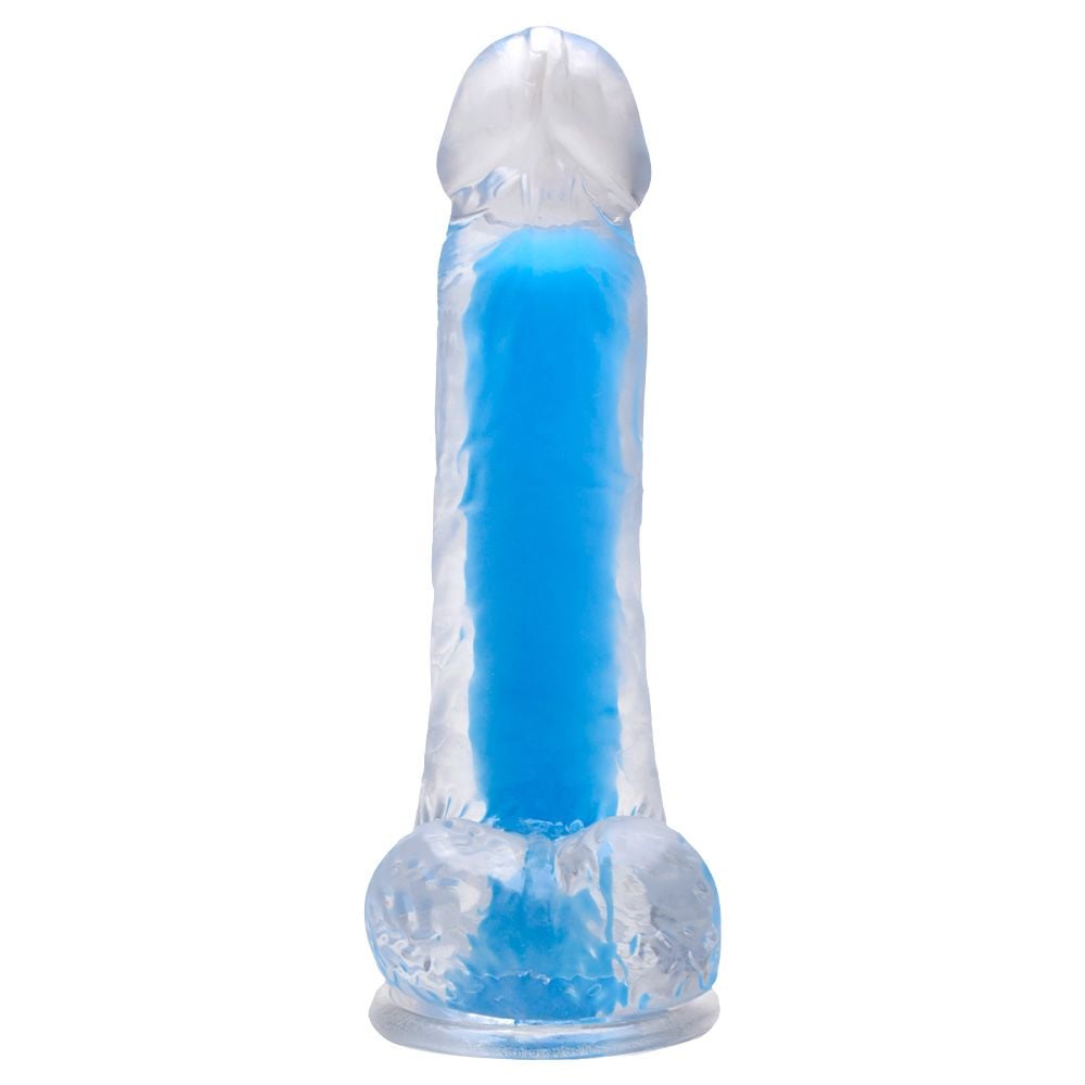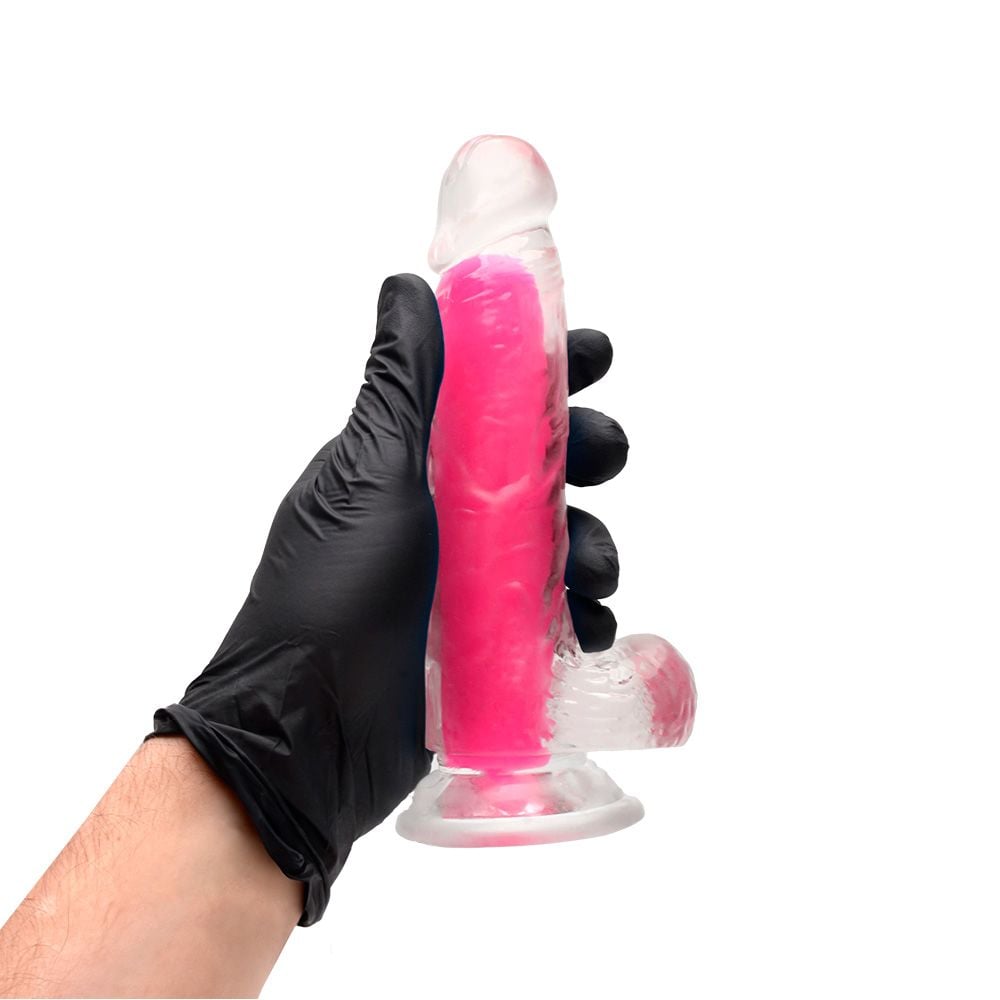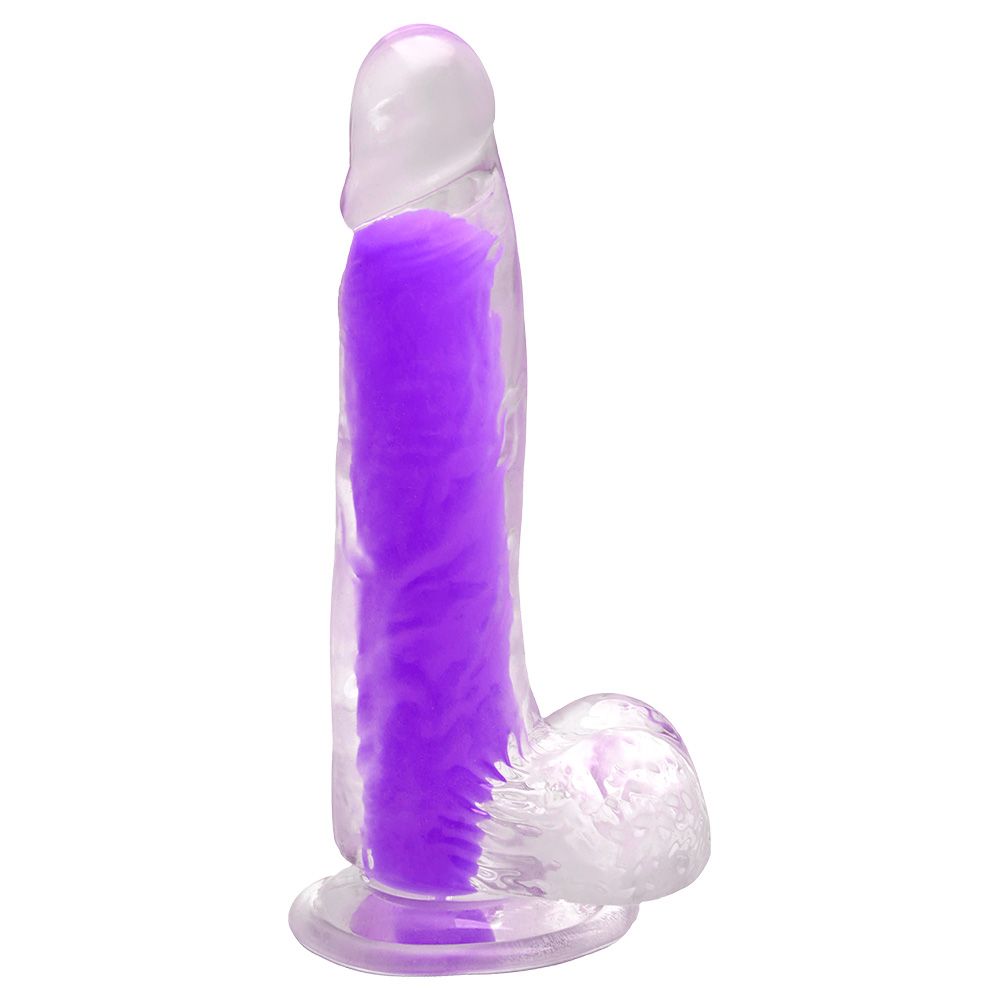 • Design: transparente com interior colorido, glande definida, veias texturizadas e escroto.