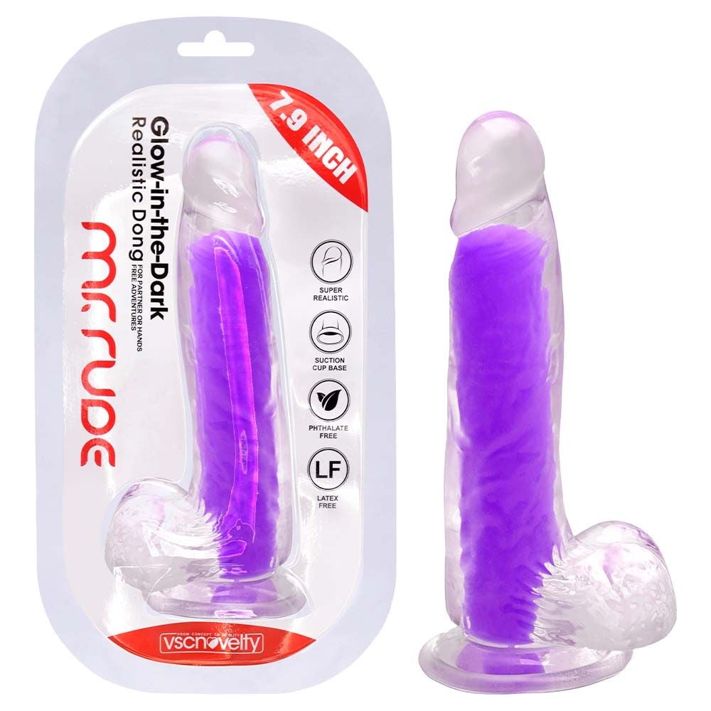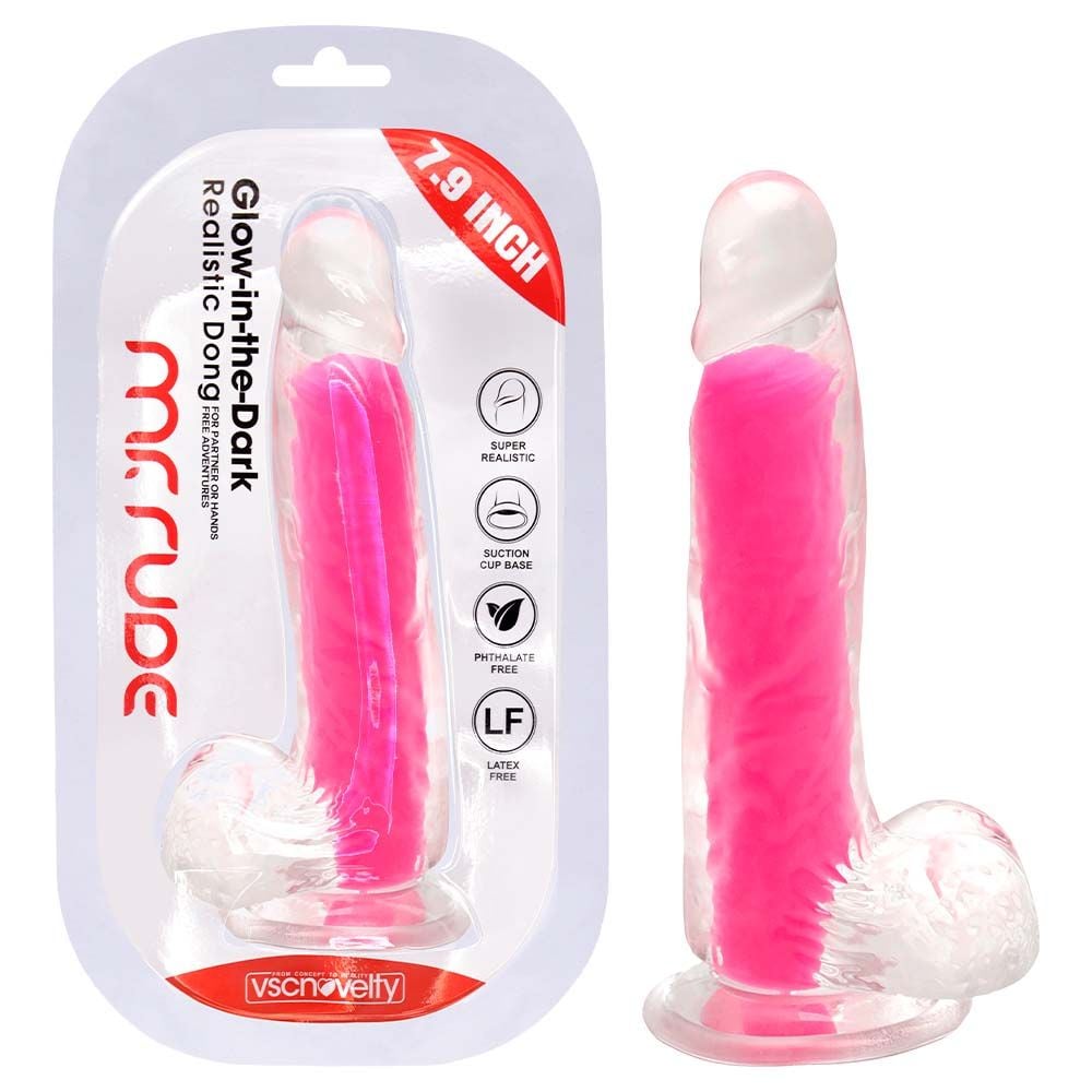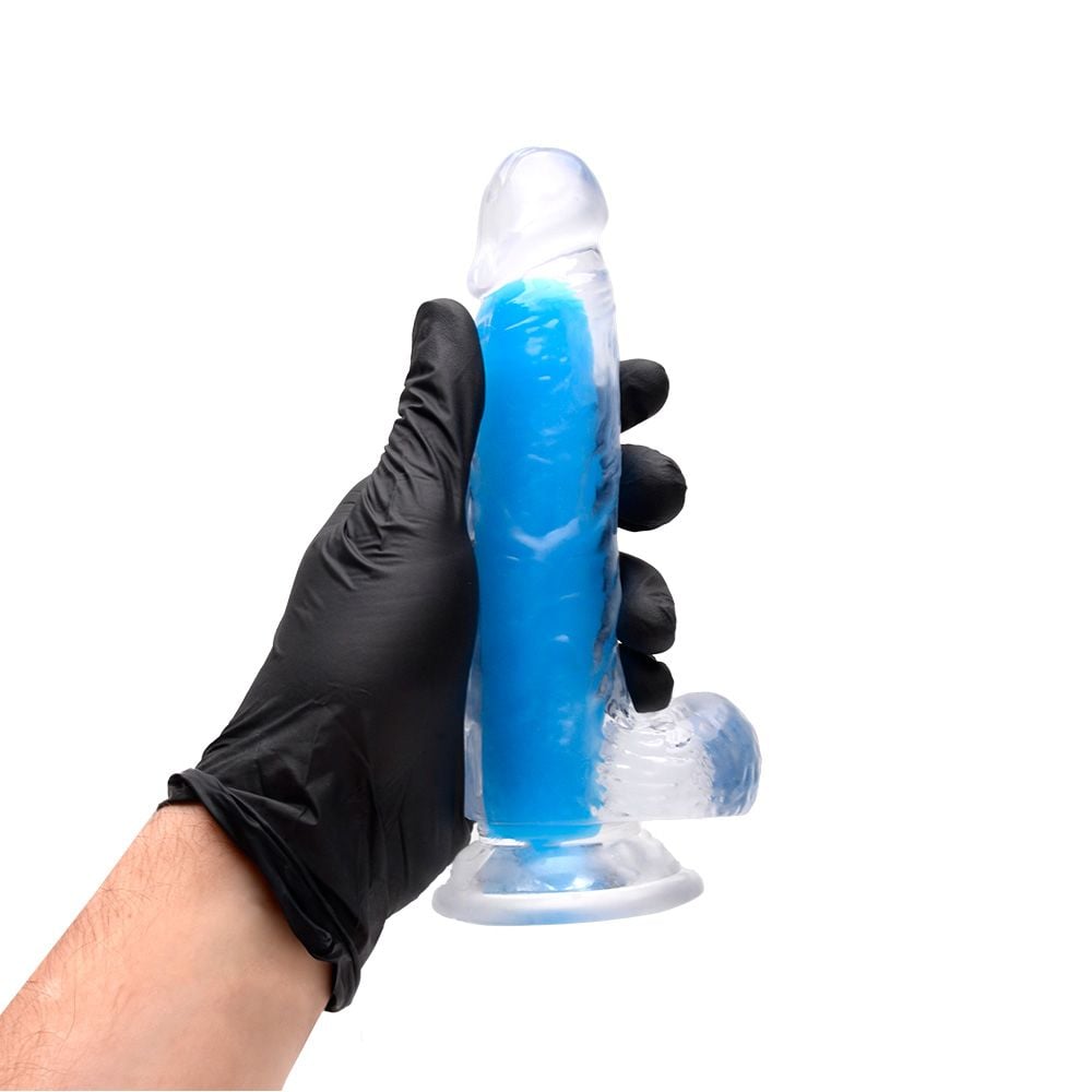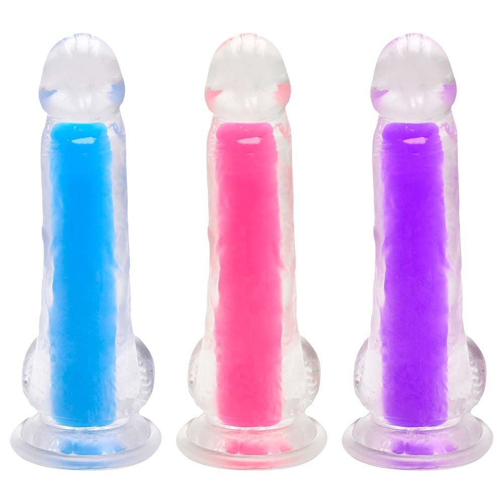 • Design: transparente com interior colorido, glande definida, veias texturizadas e escroto.