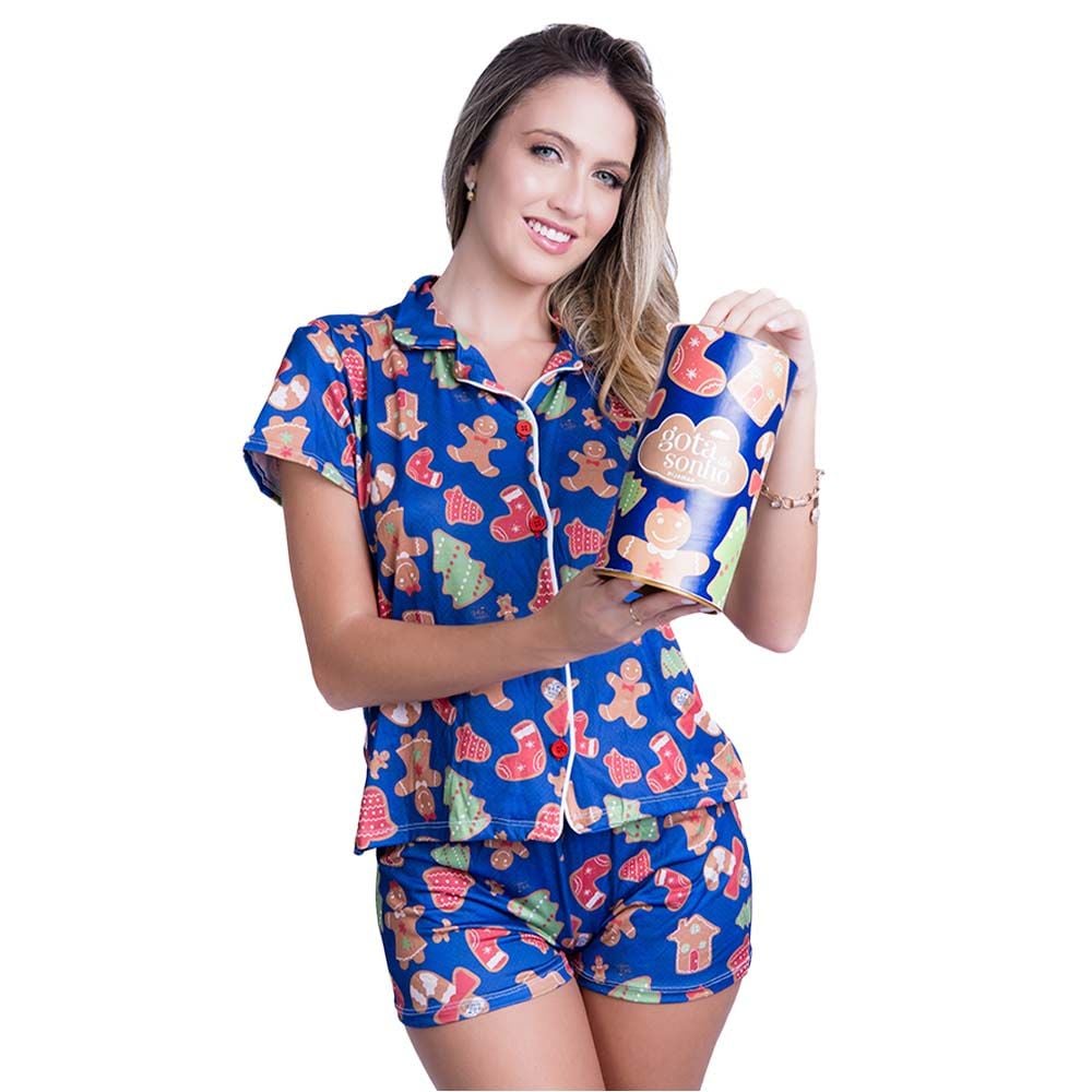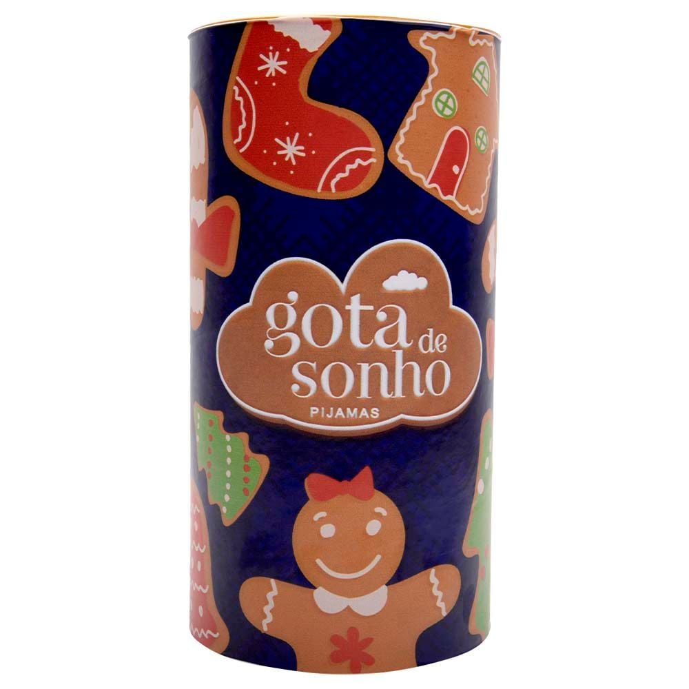 O Pijama Americano Estampa Biscoito de Natal, da desejada marca Gota de Sonho, é o convite perfeito para mergulhar no clima mágico das festas. Com uma blusa clássica de botões frontais e short confortável, esse conjunto une charme, aconchego e estilo em uma só peça. E o melhor: vem acompanhado de uma encantadora lata decorativa, que transforma esse mimo em um presente inesquecível.