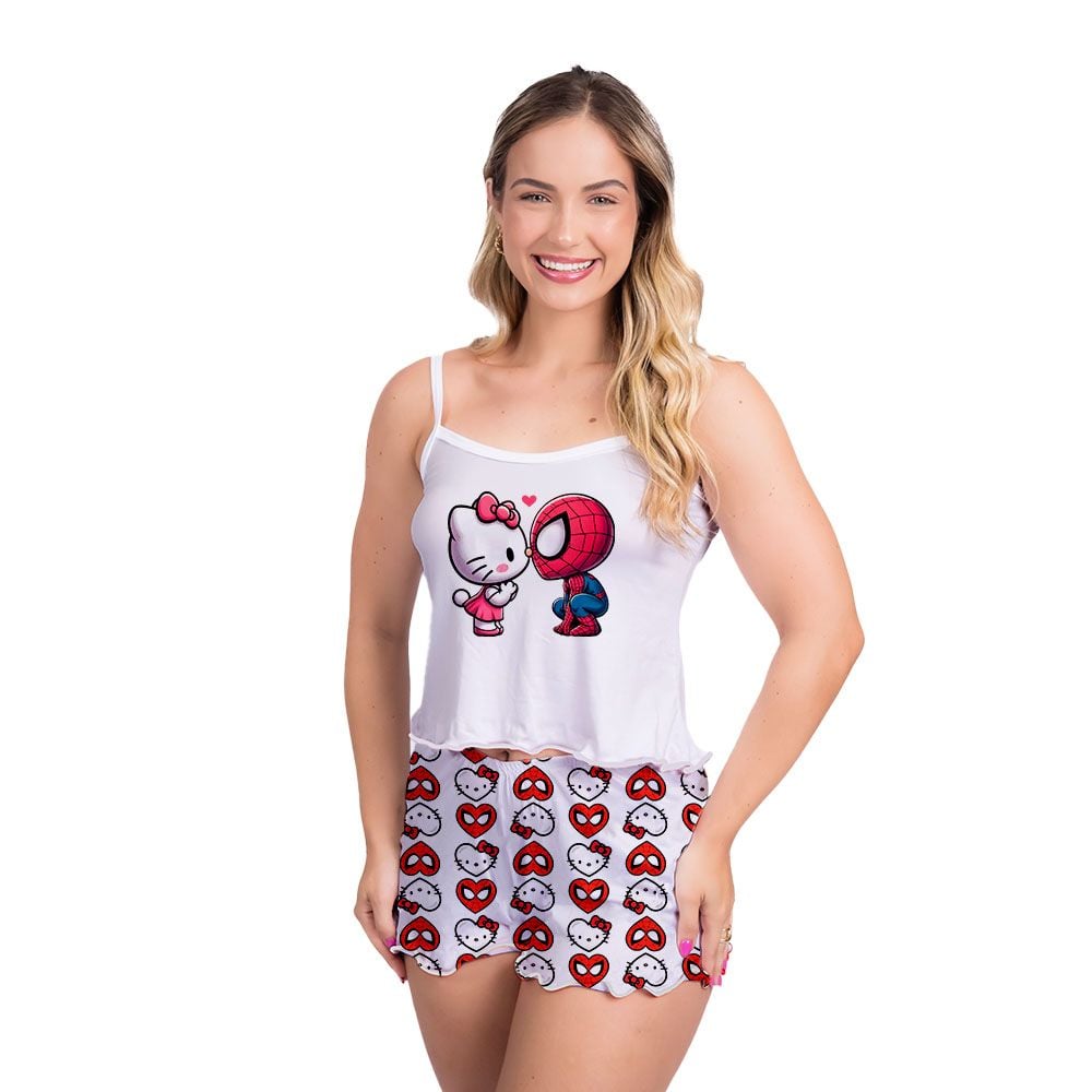 Adquira agora o Pijama Curto Vivi Estampa Hello Kitty com SpiderMan Pink da Gota de Sonho e viva momentos especiais de aconchego e diversão em uma peça exclusiva que valoriza sua feminilidade.