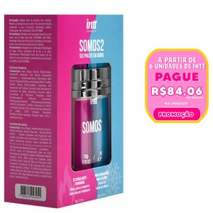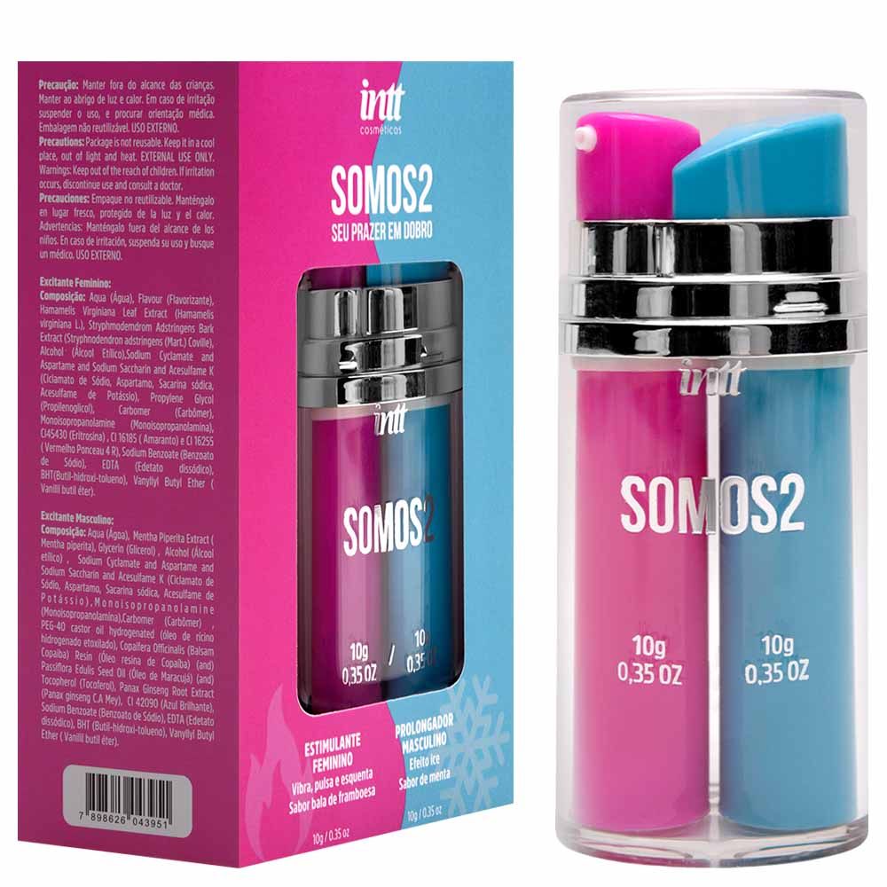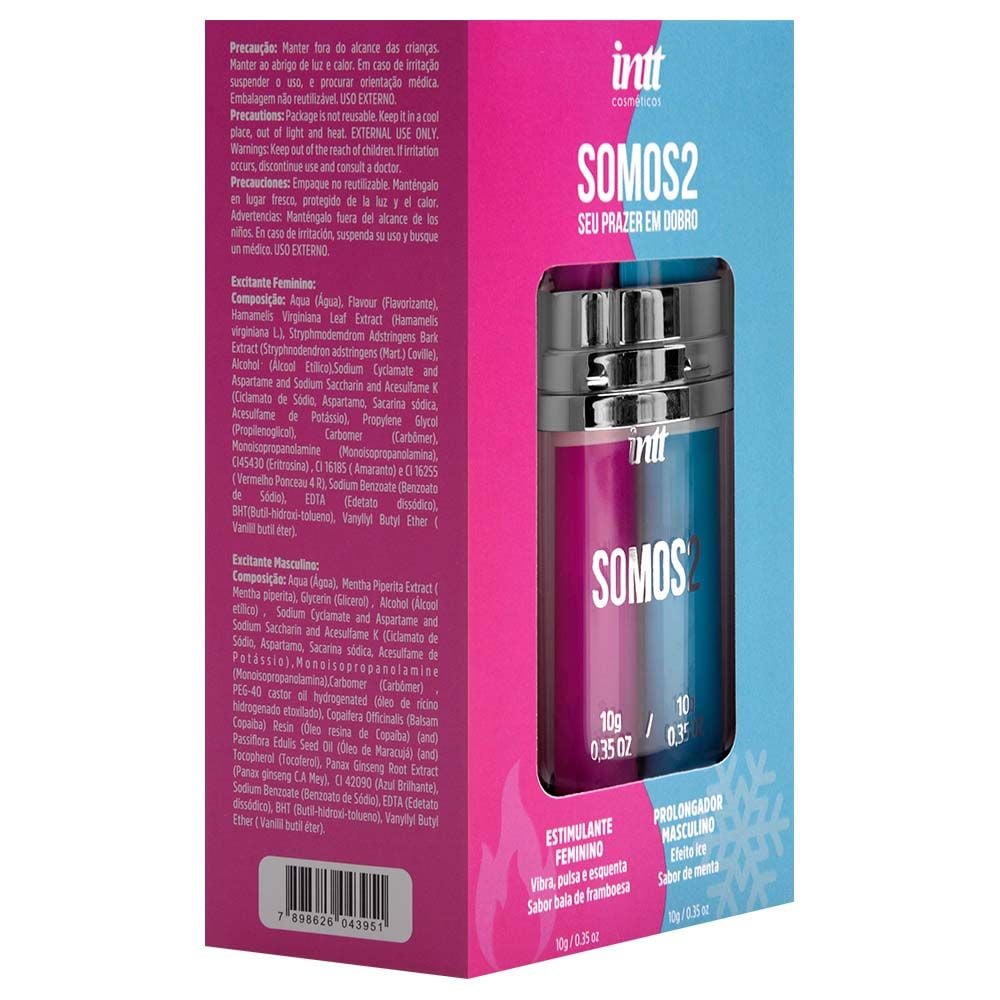O Somos2 foi especialmente formulado para ajudar os casais a redescobrirem a proximidade e a cumplicidade. Na relação a dois, o homem ganha confiança com um gel de efeito gelado que prolonga o desempenho, enquanto a parceira é estimulada com um gel que pulsa, vibra e esquenta, proporcionando prazer mais intenso e rápido.